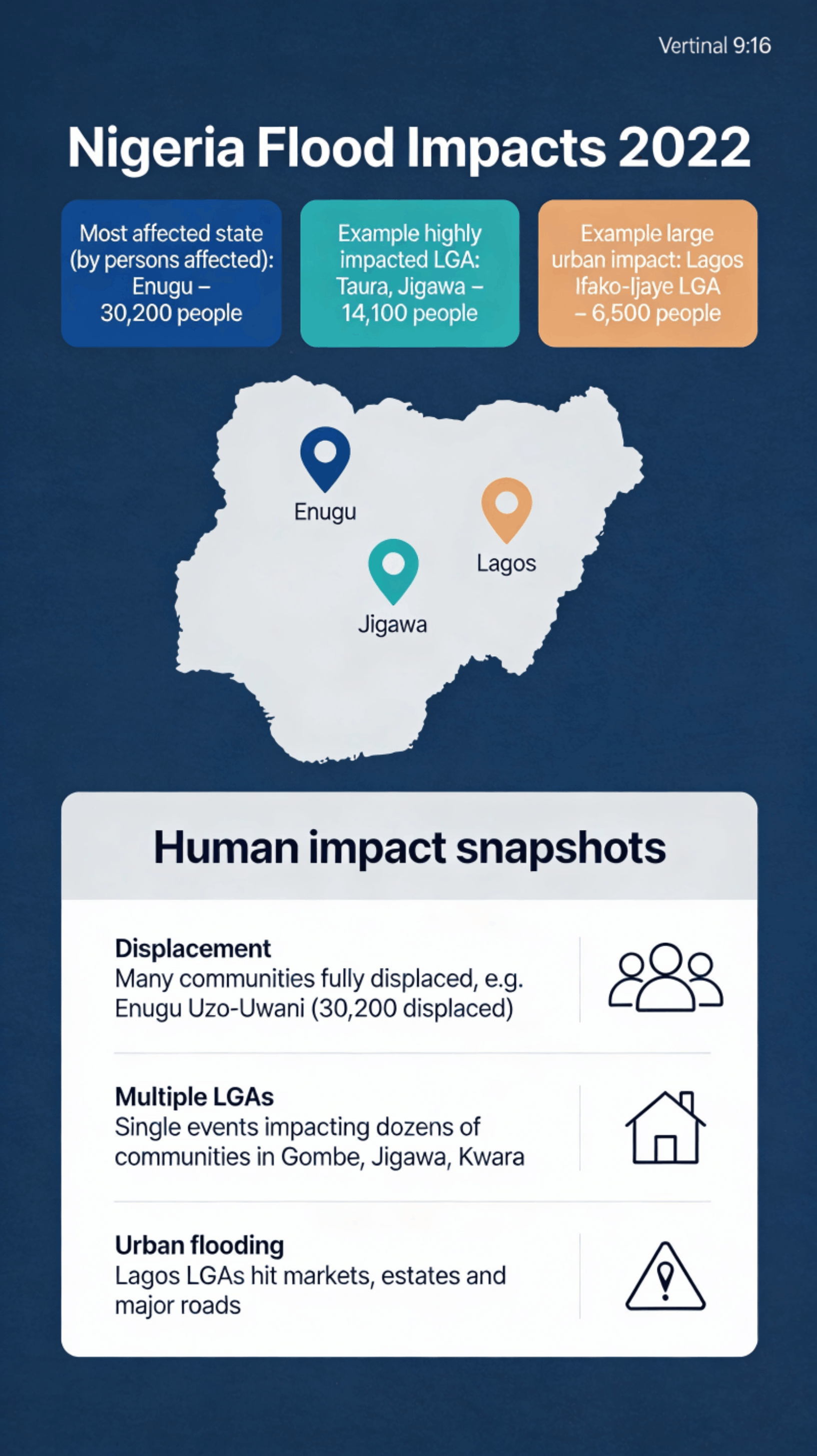 The 2022 floods affected communities across all geopolitical zones, with both rural riverine areas and major urban centres experiencing significant human and economic disruption. The distribution of impacts highlights how climate-induced flooding now cuts across state boundaries and settlement types.