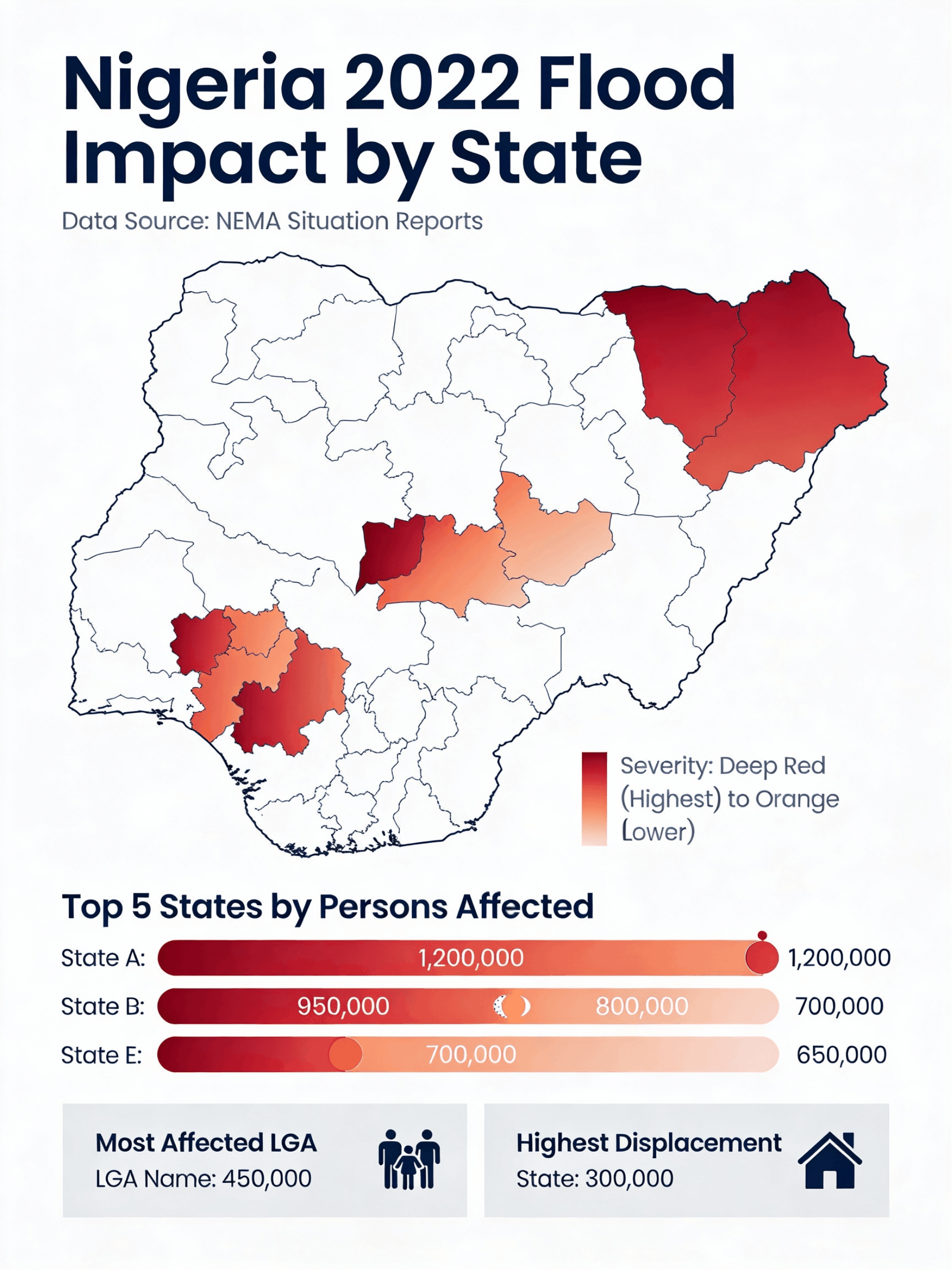 Flooding has become one of Nigeria's most severe and recurring climate risks. Evidence from 2022–2025 shows widespread human impact across multiple states and LGAs, with large-scale displacement, infrastructure damage, and livelihood disruption.