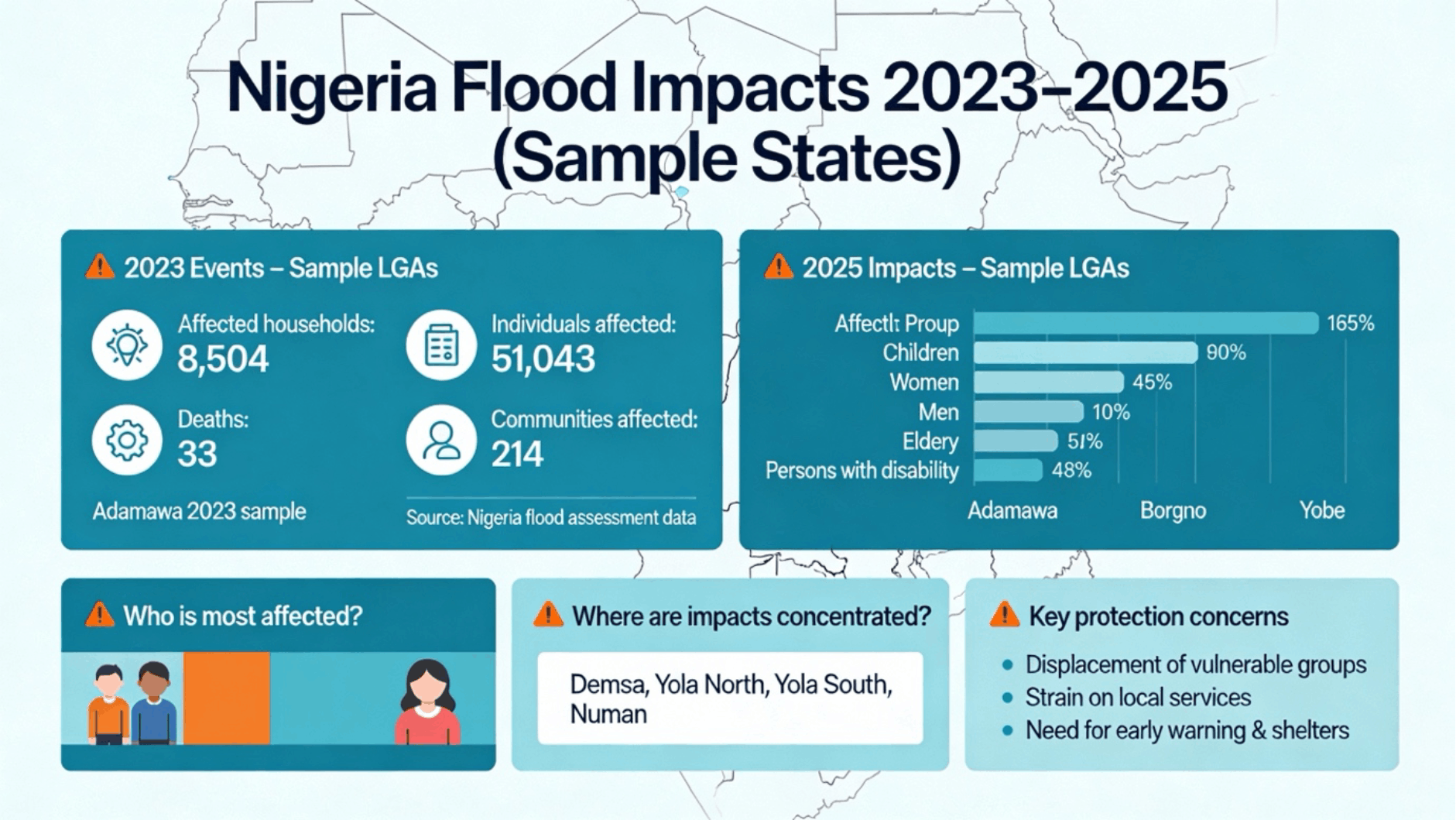 Flooding has become one of Nigeria's most severe and recurring climate risks. Evidence from 2022–2025 shows widespread human impact across multiple states and LGAs, with large-scale displacement, infrastructure damage, and livelihood disruption. The burden is heaviest in riverine and low-lying areas, and falls disproportionately on children, women, the elderly, and persons with disabilities, highlighting flooding as both a climate and social vulnerability crisis.