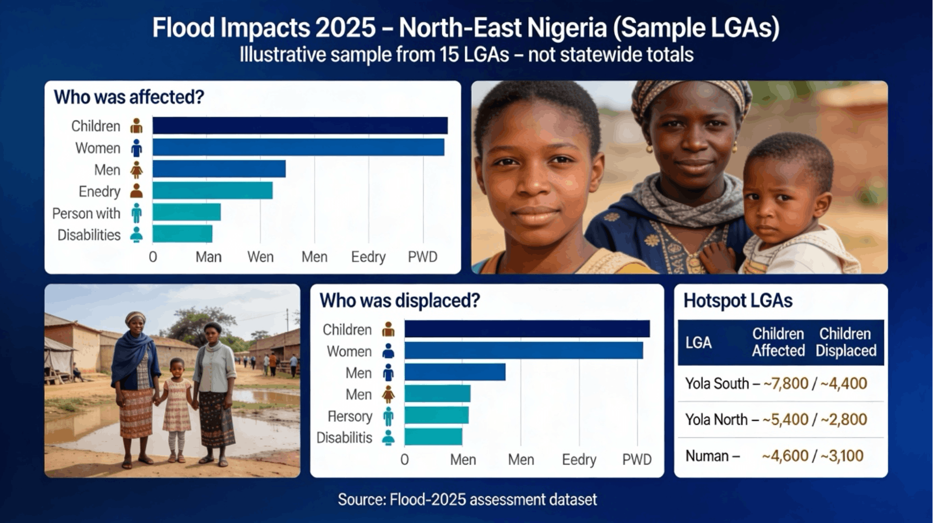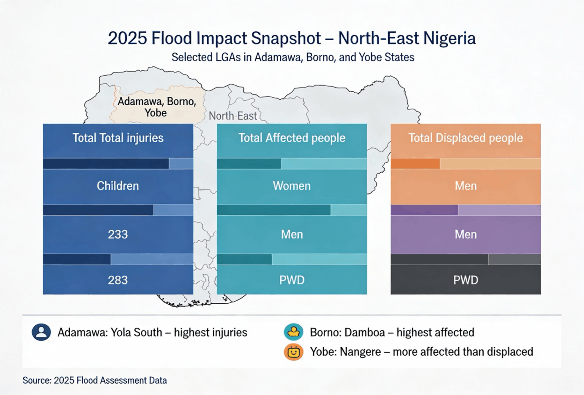 A 2025 flood impact snapshot for selected LGAs in Adamawa, Borno, and Yobe States shows differentiated human outcomes across injury, exposure, and displacement, with clear demographic and geographic concentration.